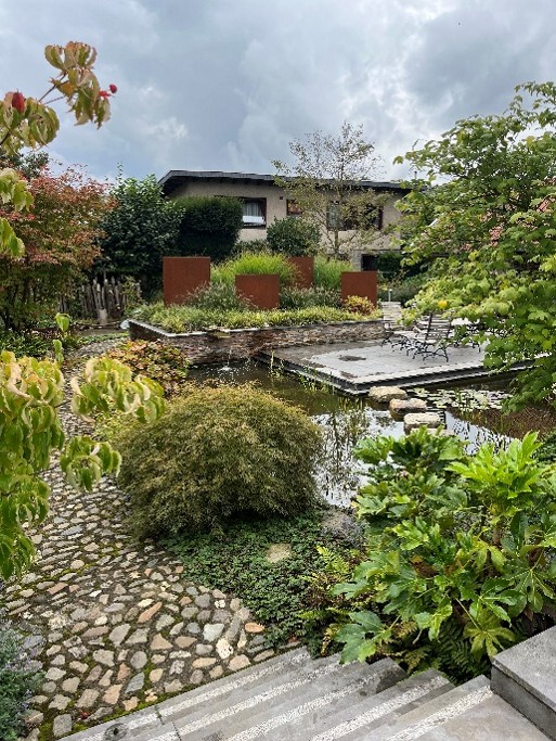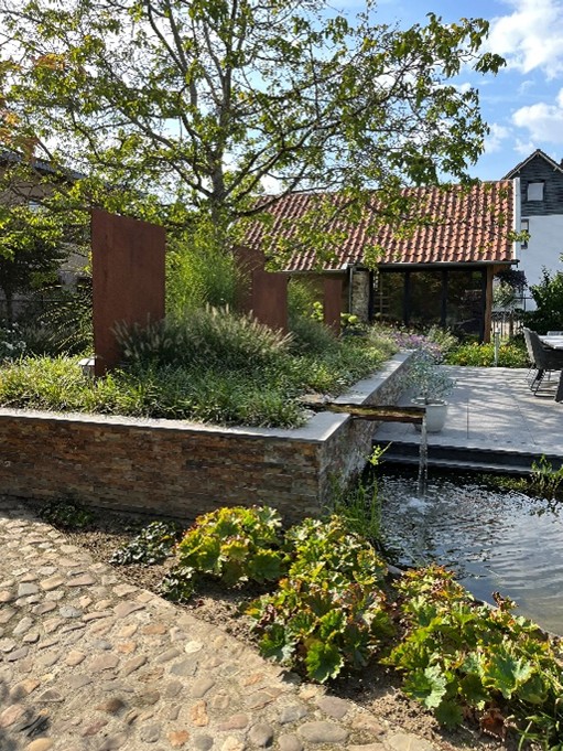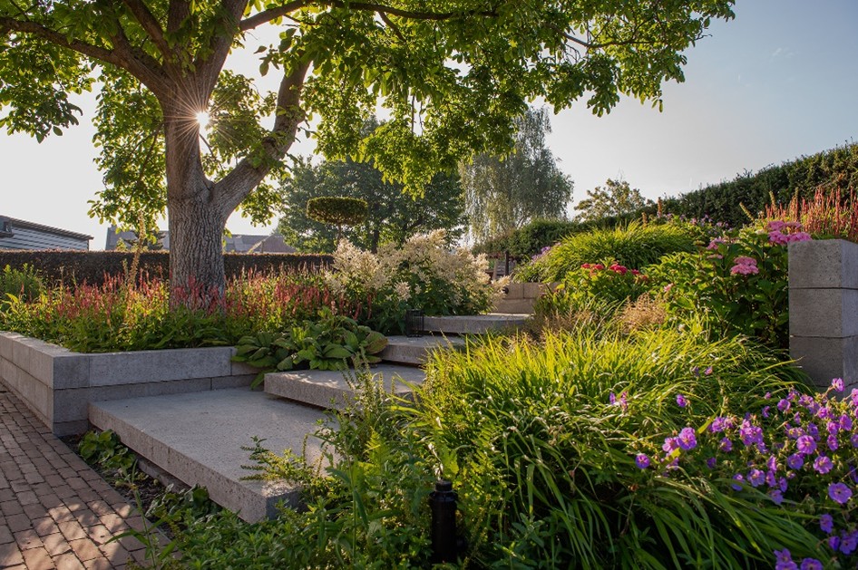 Zijn winnende tuin omvat een variatie aan materialen. Zo bestaat het boventerras uit een mix van roodbruine gebakken klinkers, terwijl de paden zijn aangelegd met hergebruikte bonte maaskeien. Diverse grote cortenstalen elementen vormen echte blikvangers in de tuin. De trapjes zijn gemaakt van hardsteen met steenstrips van rusty slate. 'In de vijver heb ik stapstenen van arkose-zandsteen gelegd', vertelt Leinders. Speciale aandacht ging uit naar de uitgebreide beplanting, die bestaat uit een mix van sierheesters, bomen, zoals esdoorn en Heptacodium (zevenzonenboom), en vaste planten, zoals Geranium 'Rozanne', Agastache 'Black Adder', Astrantia en Anemone. Met het oog op de onderlinge verhoudingen tussen planten en bomen herplaatste Leinders veel van de bestaande beplanting. Grassen en varens zorgen voor extra structuur.