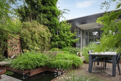 De mooie stadstuin aan het Arnhemse Sonsbeekpark, aangelegd door Ruinard Hoveniers, valt op door het samenspel van verschillende materialen en een overvloed aan groen. Op enkele rozenstruiken na bestaat de beplanting volledig uit nieuwe aanplant. ‘We reserveren bewust budget voor grotere meerstammige bomen,’ vertelt Frank Ruinard. ‘Zo krijg je een tuin die na drie maanden al heel volwassen aanvoelt. In combinatie met zorgvuldig grondwerk betaalt die investering zich direct uit in kwaliteit.’