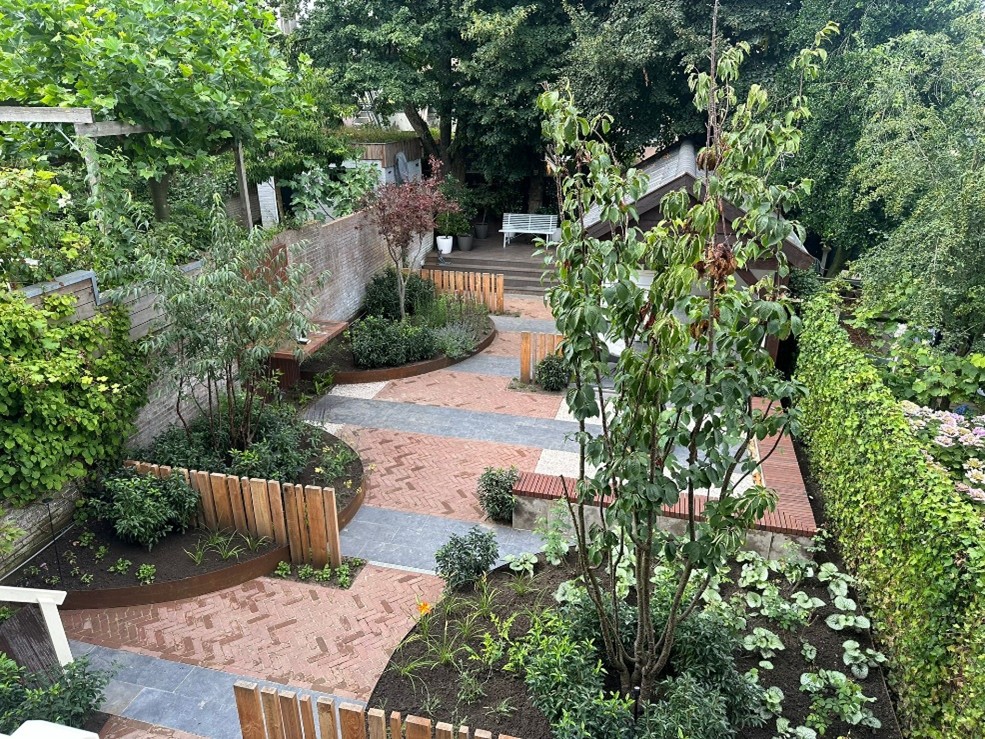 Opvallend is de combinatie van weelderige beplanting met luxe materialen, zoals de zwevende trap van grootformaat Schellevis-tegels. ‘Door de vele erfgrenzen was het een uitdaging om samenhang te creëren. We hebben dat opgelost door rust te brengen met duidelijke zichtlijnen en looppaden. In die zin is het best een strakke tuin geworden. Het is dan mooi om daarin het weelderige van de beplanting op te zoeken en met kleur, geur en smaak te werken.’